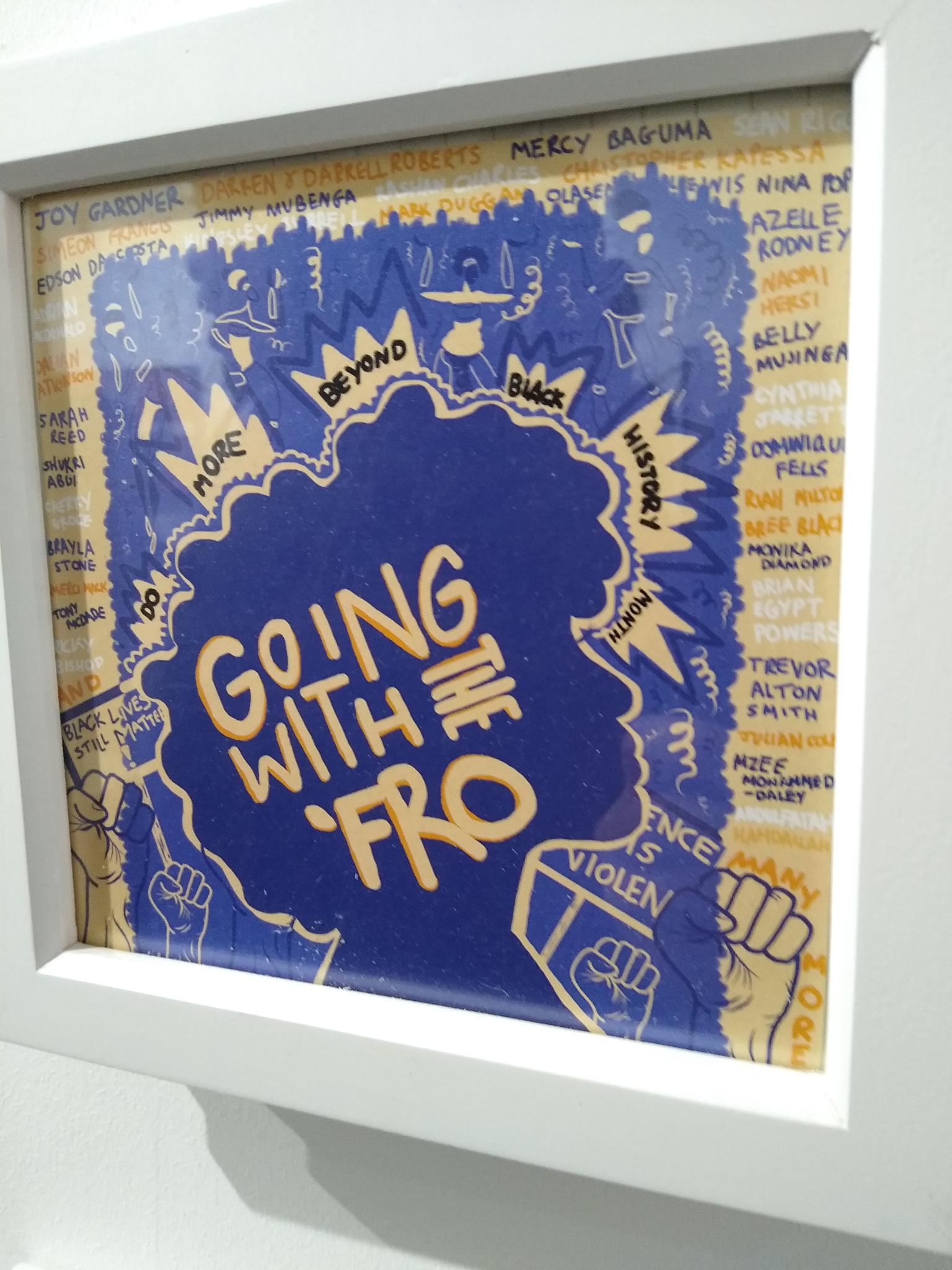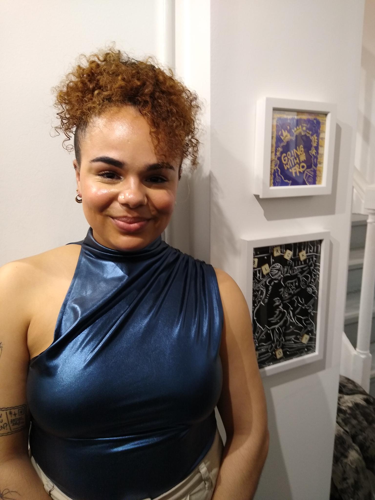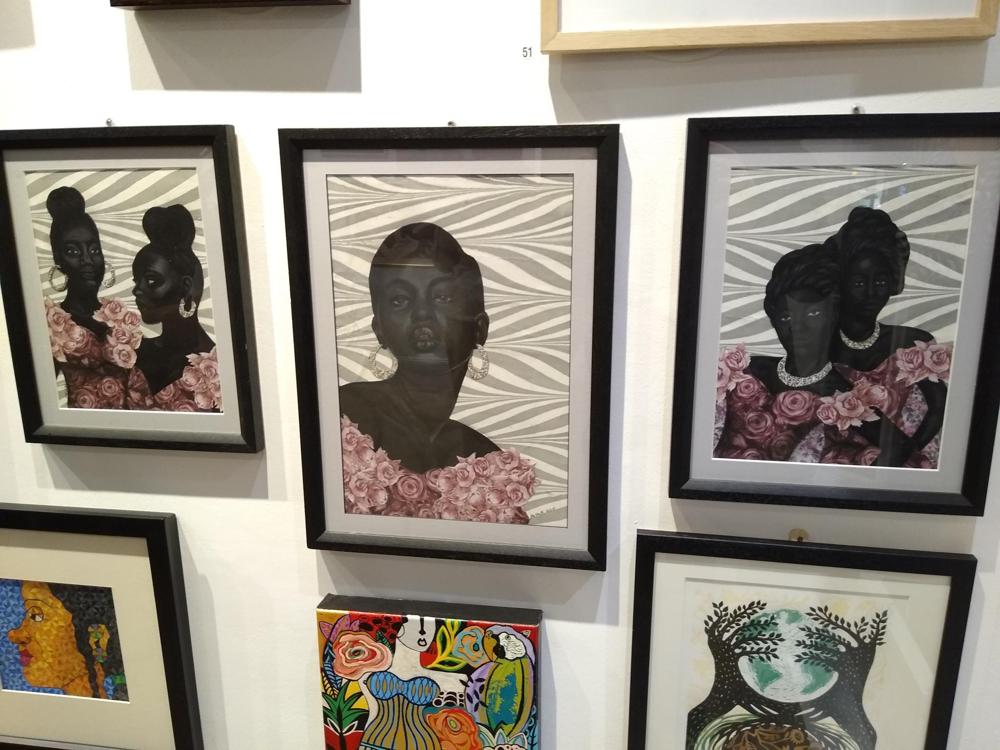 Once inside, it was possible to talk with both artists and Sukai Eccleston, Founder of CasildArt, though in Sukai’s case, catching her for more than a few seconds at her own event was a challenge. Talking with artist Natalia Lewandowska (with me, above), whose artwork greeted people immediately on entry, was somewhat easier, when numbers – eventually – thinned. Up until then, though, the event was standing room only on both floors, and splilled into the street.
