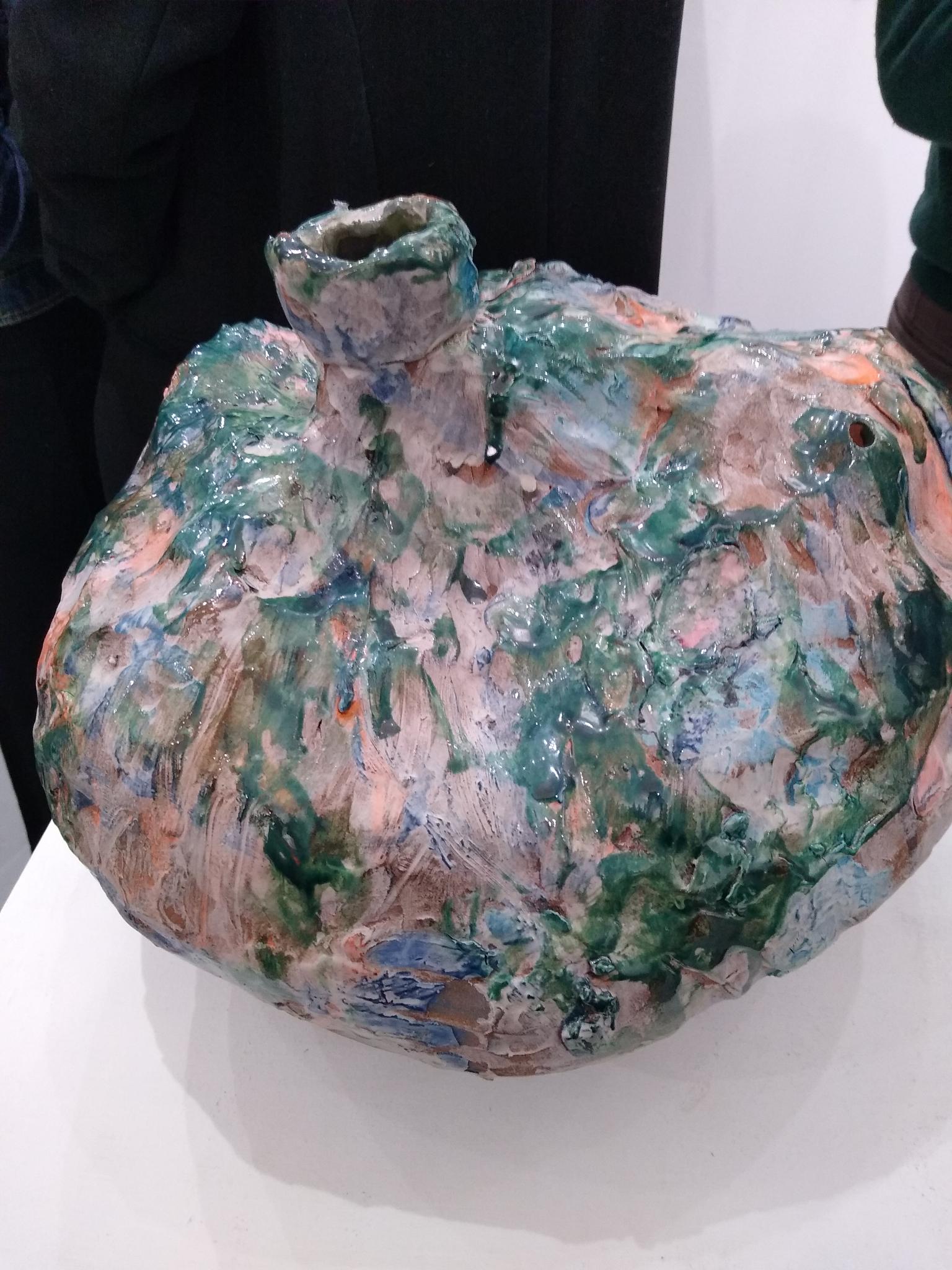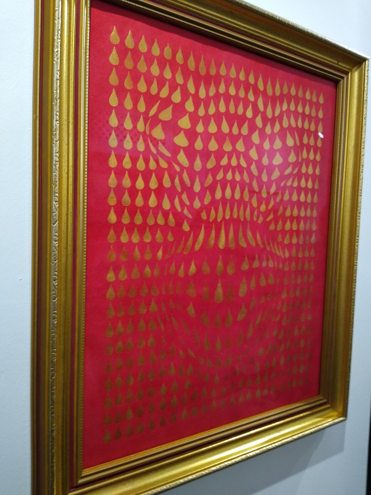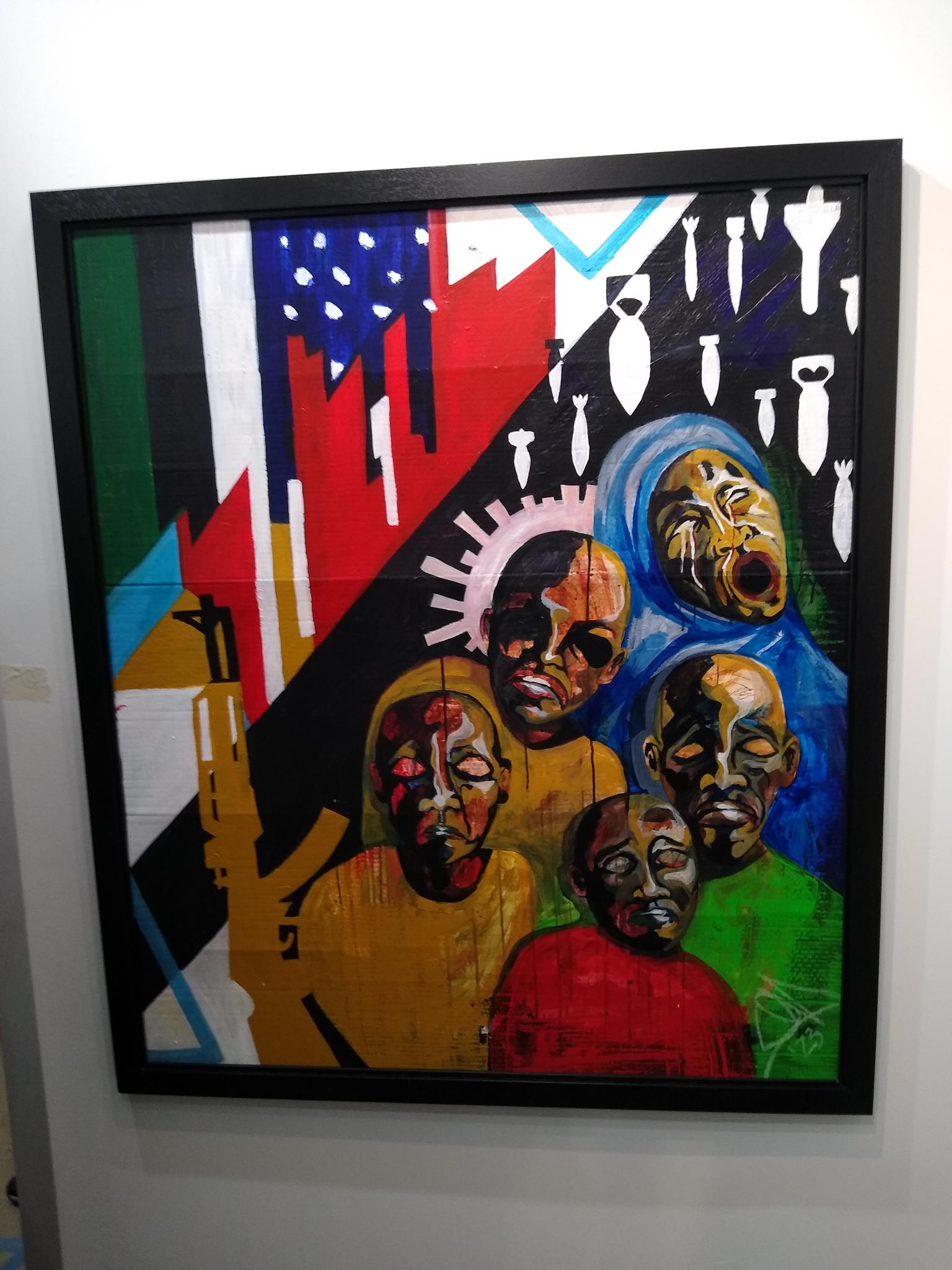 Once inside, it was possible to talk with both artists and Sukai Eccleston, Founder of CasildArt, though in Sukai’s case, catching her for more than a few seconds at her own event was a challenge. Talking with artist Natalia Lewandowska (with me, above), whose artwork greeted people immediately on entry, was somewhat easier, when numbers – eventually – thinned. Up until then, though, the event was standing room only on both floors, and splilled into the street.