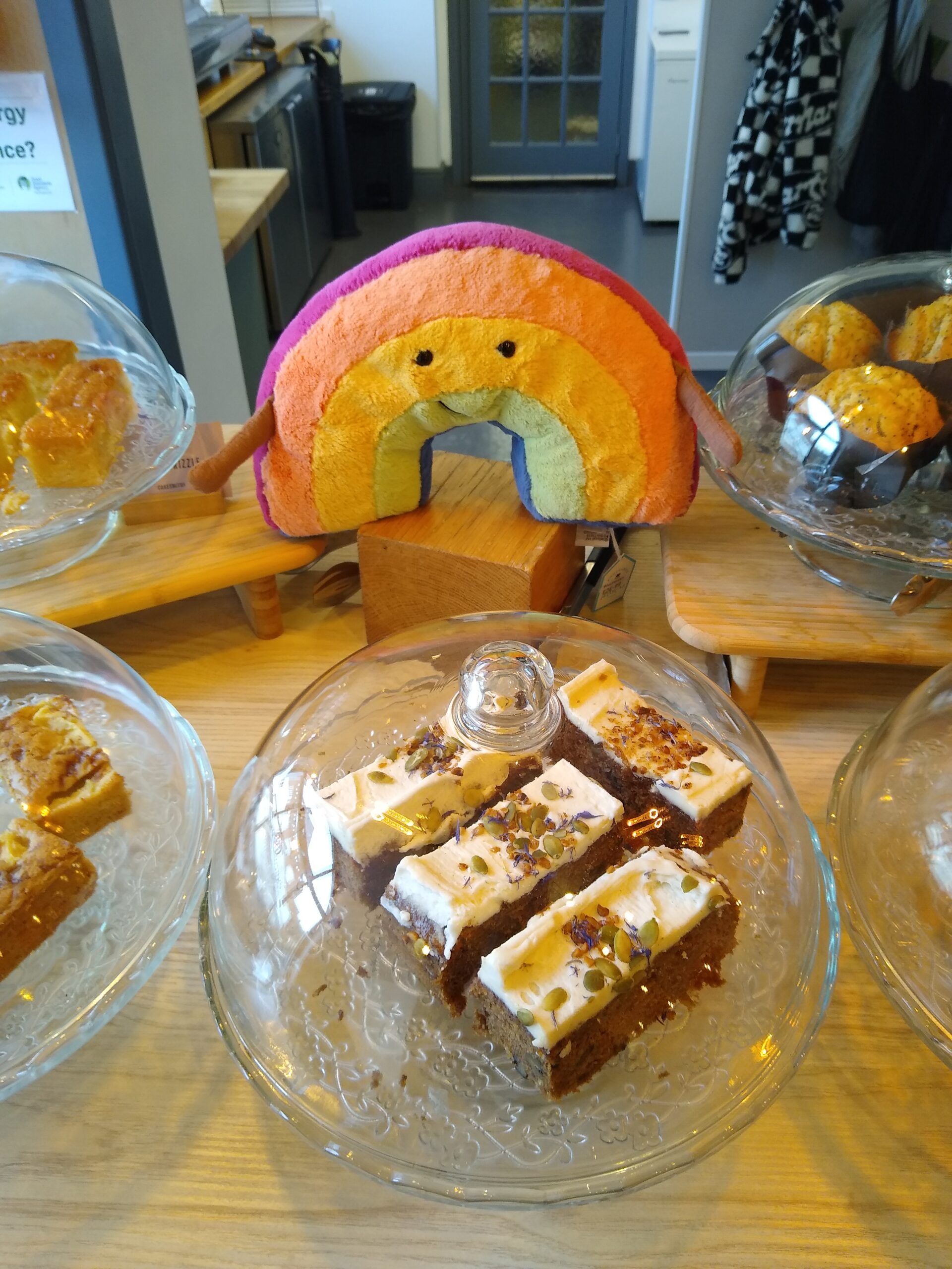 Roving Rainbow’s label name is ‘Amuseable Rainbow’, To us, he, she, or they are more flexible than that. As Roving Rainbow roves, there will be temporary Rainbow names inspired by others. Friendly people who are up for a bit of fun and a picture! So, at Fruitworks, Roving Rainbow became Shannon Rainbow, after the smiling coffee shop waitress pictured above. More will be coming, if they are up for the distinction! One of the lovely staff in Newman Flexible Workspace in Bromley, and Community Manager George at Islandworks in Sheerness. There are more images from Fruitworks, including Shannon Rainbow having a cup of coffee, below. Plus Tony and Paul, management at Fruitworks, and just as welcoming as the cafe staff.