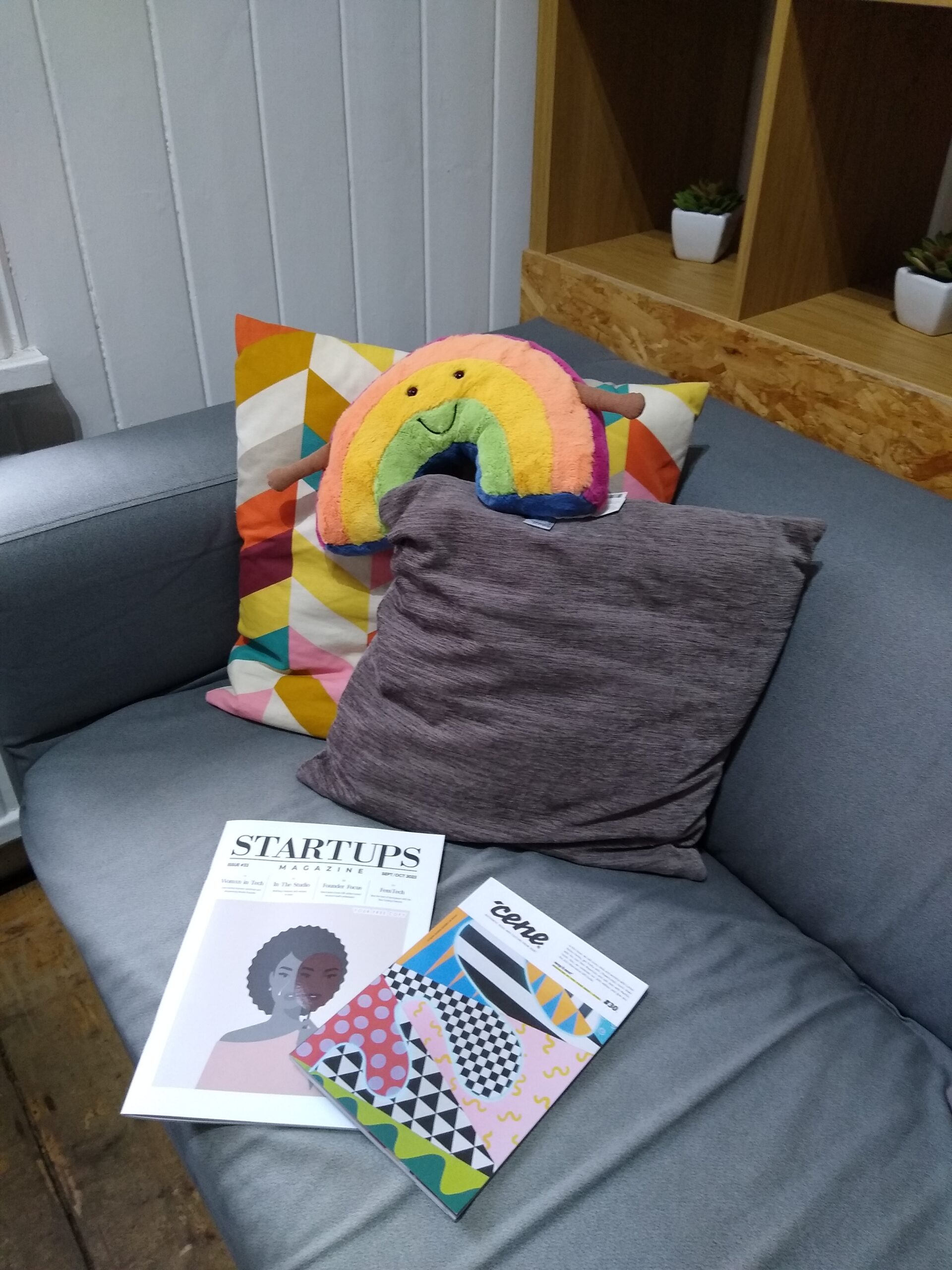 Feature image: Roving Rainbow pictured in Fruitworks coworking space in Canterbury, Kent.